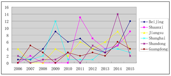 In addition to these provinces, there are specific areas in which individual provinces have been important innovators for specific renewables. As shown in Figure 5, Figure 6, Figure 7, Figure 8 and Figure 9, Jiangsu also has the highest number of patents in wind, solar and ocean, Beijing has the highest number of patents in geothermal and biomass, in addition to Jiangsu and Beijing (provinces which have been consistently important innovators for most renewables), other important innovators for specific renewable energy sources have included Shanghai (wind), Shandong (solar, biomass), Guangdong (ocean), Zhejiang (ocean) and Shaanxi (geothermal).