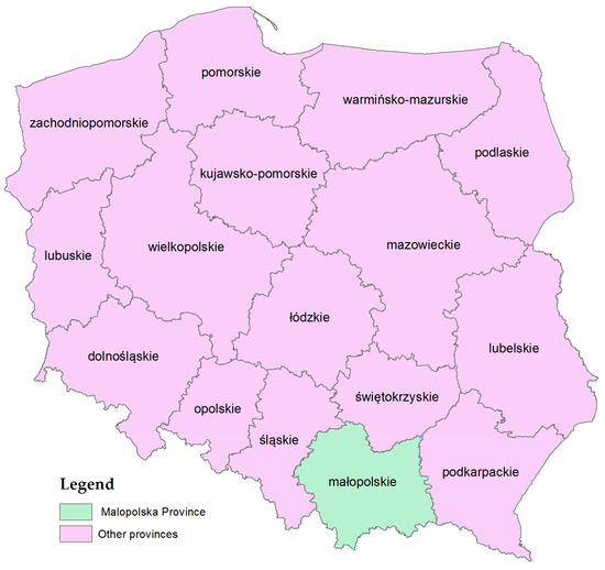 Malopolska is characterised by a great variety of landscape features, geological structure, climatic, hydrological and soil conditions. Agricultural land is the main form of land use in the Malopolska province. By 2015, it covered a total of 537,500 ha, constituting 81.0% of the total area of agricultural holdings in the province. The vast majority (96.8% of the total agricultural land) belonged to individual farms [52]. The most favourable soil conditions for agricultural production are located in the eastern and northern parts of the province and in the northern part of the Carpathian foothills. Over recent years, there has been a systematic decline in the area of land devoted to agricultural use.