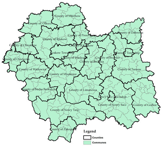 The research area covered the Malopolska province, one of 16 provinces in Poland (Figure 1). The Malopolska province covers an area of 15,183 km2, which accounts for 4.9% of the country’s territory and ranks the region in 12th place with regard to area. Administrative divisions divide the province into 22 counties, consisting of 182 communes: 46 municipal-rural communes, 14 municipalities and 122 rural communes (Figure 2). This province was selected for the analysis because it has one of the largest areas of land converted annually to non-agricultural use in Poland.