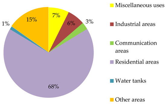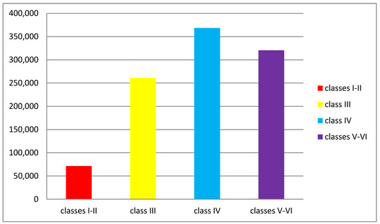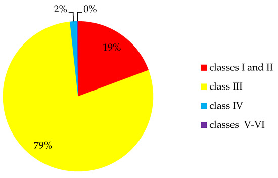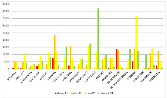 Due to the objective of this research, it was necessary to carry out research regarding the definition of quality classes of agricultural land converted to non-agricultural use and earmarked for residential purposes. The pie chart (Figure 10) depicts the percentage share of specific classes of land converted for residential purposes in 2010–2016 for the whole region.