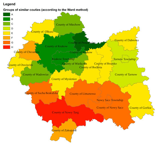 Based on the bar chart in Figure 4, the dendrogram presented in Figure A1 (Appendix B) was developed using the Ward method. This allowed the distinguishing of eight groups of counties (A–H) according to their similar attributes (quality classes). The size of the area of the soils of the best quality class was adopted as a leading attribute.