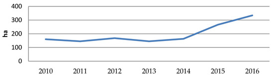 Surface area of the whole agricultural land converted to non-agricultural use in individual counties of the Malopolska province in the years 2010–2016, expressed in hectares (ha) (Appendix D).