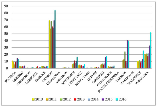 It should be emphasised that the Malopolska province is a particularly difficult case as far as data acquisition for the analysis of record data is concerned. The province consists of 22 counties and 182 communes covering 4,516,496 record parcels. In many counties of the Malopolska province, geodetic and cartographic documentation databases are still maintained in an analogue form. The graphic part, i.e., the cadastral map for rural areas, is maintained in the vector form for only approximately 35% of the province area and for the remaining rural areas, it is still a map in an analogue form. A large share of the descriptive part of the record data utilised for the preparation of this paper (225 files in Appendix C and 7 files in Appendix D) is analogue (non-electronic). Although the data on the size of land converted to non-agricultural use collected by the Marshal of the province is available for a period longer than seven years, the key data for this article was that from the districts regarding land quality classes. The data for the whole province exists only for the period 2010–2016. Thus, it is not possible to perform a long-term analysis in the Malopolska province. For statistical analyses, creating graphs, data operations and data transformation, the authors used the Statistica software.