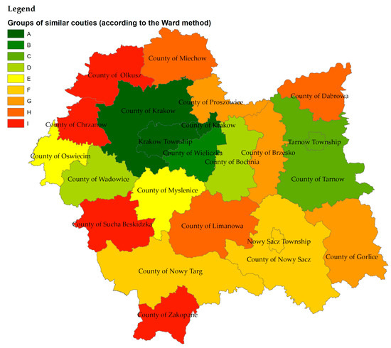 This bar chart (Figure 7) reflects the intensity of changes in land use in each county in individual years. The data from this chart is the input data (characteristics of the counties) in the elaborated dendrogram. The data from Table A2 and Figure 7 is used to compile dendrogram (Figure A2) based on which and using the Ward method, nine groups of counties (A–I) that are similar in terms of the size of agricultural land converted to non-agricultural use are distinguished. The results are presented on the map (Figure 8).