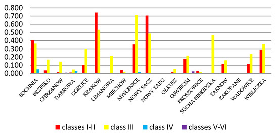 The results of the study presented in Figure 10 demonstrate that as much as 79% of the agricultural land converted to non-agricultural use and earmarked for residential purposes constitute soils of class III, i.e., good soils. The Malopolska province has only 26% of such soils. Surprisingly, as much as 19% of the agricultural land converted for residential purposes constitute the best soils (classes I–II). Malopolska has only 7% of such soils.