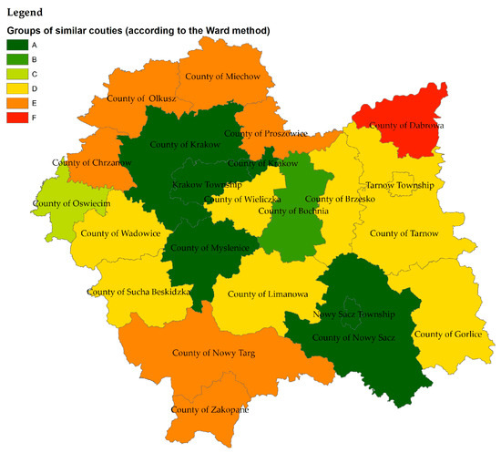 The vertical axis of the dendrogram represents the county numbers, according to Table A3, while the horizontal axis—a dimensionless number representing the distances of clusters (regions). The red line is a fixed threshold value that provides the appropriate number of classes (A–F).