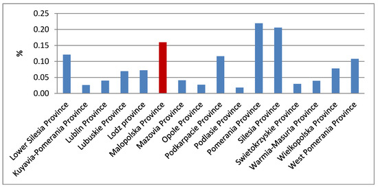 Malopolska takes the third place in the country regarding the surface area of agricultural land converted to non-agricultural use in the years 2010–2015, as illustrated in Figure 13.