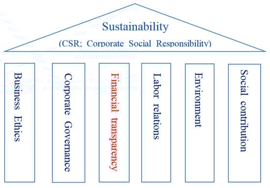 To ensure sustainability, companies should approach stakeholders in an integrated manner rather than individually. In other words, to achieve sustainability, companies must focus on all aspects of their business, including corporate governance, accounting and transparency of transactions, business ethics, labor relations, environmental management, and social contributions. Figure 1 illustrates the components of corporate sustainability. This study focuses on the relationship between financial transparency and sustainability [3,4].