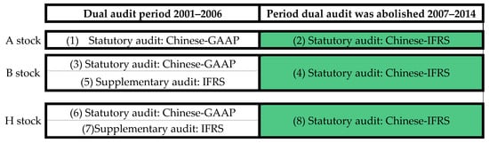The empirical analysis proceeds as follows. First, during the dual audit period (from 2001 to 2006), the earnings quality gap between foreign-invested companies and A-companies is verified. A foreign-funded company with dual audits is expected to have less earnings management than an A-valued company audited only according to Chinese-GAAP. To eliminate the influence of accounting standards, we compare Chinese-GAAP financial statements of foreign-capital stock companies (B stock and H stock) with Chinese-GAAP financial statements of A-share companies, as shown in Figure 2 ((3) and (6) compared to (1)). Second, we examine the difference in earnings quality between foreign-invested companies and A-listed companies after the elimination of the dual audit (2007–2014). If a foreign-equity enterprise receives a single audit, it is expected that there will be no difference in earnings management compared to an A-stock company (as illustrated in Figure 2, (4) and (8) compared to (2)). Finally, to exclude the effects of the characteristics of foreign-owned enterprises, we compare periods for foreign equity companies by comparing the earnings management of foreign stock companies before and after the dual audit (as illustrated in Figure 2, (3) and (6) compared to (4) and (8)).