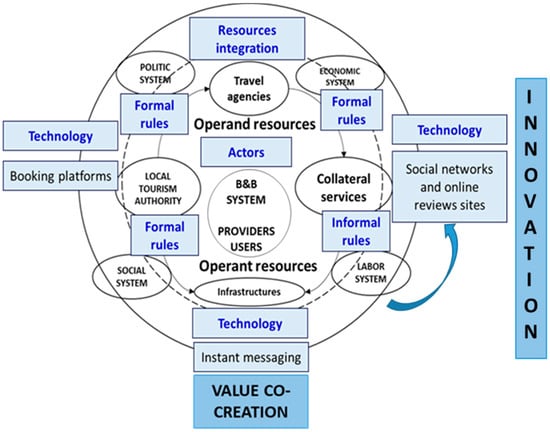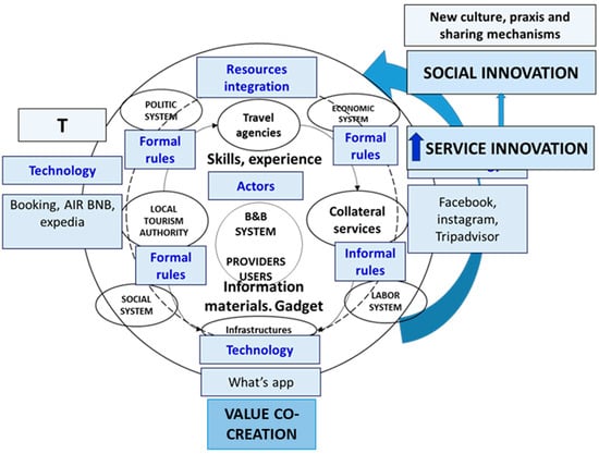 64]. At the same time, institutions have an impact on social dimensions, allowing the transition from “simple” service innovation to social innovation intended as the co-creation or collaborative recombination of practices that provide novel social practices, such as new value, culture, rituals, and symbols deriving from experiences integration.