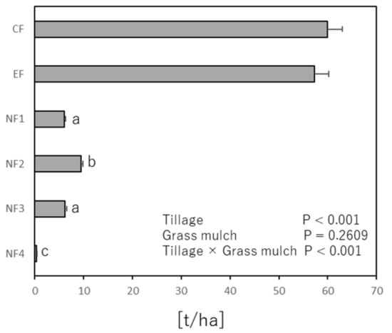 The yield was the highest for CF at 60 t/ha, but there was no significant difference between CF and EF (Figure 1). Tilling and no grass mulching (NF2) had the greatest yield among the four NF treatments. Grass mulching did not have a positive effect on yield in the tilling system, but it had a strong response in the no-till system and improved yields at the same level as that of tilling with grass mulching (NF1).