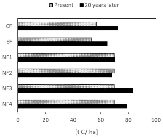 The changes in soil organic carbon predicted over the next 20 year period are shown in Figure 3. Soil carbon storage for CF and EF was expected to increase by 120% relative to the present. NF sites with zero tillage are also expected to increase soil carbon by 110–120% of the levels found in CF and EF. In contrast, NF sites with tilling are expected to remain the same or lower over the next 20 years, suggesting that the input of organic matter is not enough for maintaining soil organic carbon.