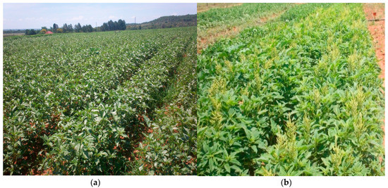 (a) Corchorus olitorius; (b) Amaranthus cruentus growing under commercial production in the trial at Roodeplaat in 2012 summer season.