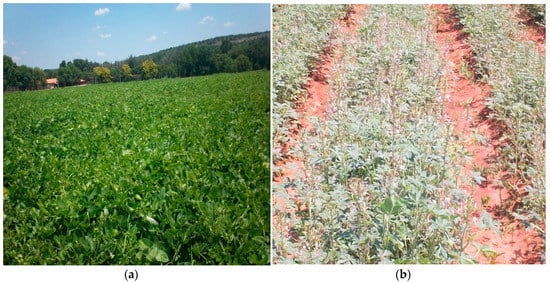 Vigna unguiculata is a leaf and pulse crop that belongs to the Leguminosae family (Figure 2a). It is an annual or perennial herbaceous plant with tri-foliate leaves [1,6,14]. Different varieties exist, varying from prostate indeterminate types to erect, determinate, low-branching types. The varieties mainly used as a leafy vegetable are the spreading, prostrate types. Various subspecies of Vigna unguiculata are found in the wild in the eastern parts of the KwaZulu-Natal, Mpumalanga and Limpopo Provinces. These subspecies include: Vigna unguiculata subsp. dekindtiana var. dekindtiana, V. unguiculate subsp. dekindtiana var. huillensis, V. unguiculata subsp. rotracta, V. unguiculata subsp. stenophylla, V. unguiculate subsp. tenuis var. ovata, and V. unguiculata subsp. unguiculata, with Vigna unguiculata subsp. unguiculata the most commonly found [1,6,14]. Vigna unguiculata is widely cultivated in summer for its seeds and as a fodder crops. Its use as a leafy vegetable has not received much attention [1,6,14].