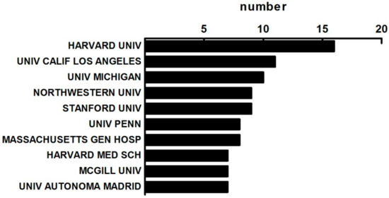 Harvard University has the greatest number of publications with a total of 16 papers, accounting for 1.62% of all publications in this field. Bates et al. [28] from the Harvard University presented six cases to reduce the costs of healthcare through the use of MBD. Their findings have the policy implications for regulatory oversight, the way to address privacy concerns, and the assist of research on analytics. At the second position is the University California Los Angeles with 11 publications followed by the University Michigan, the Northwestern University, and the Stanford University. There are 8 American institutes in the top 10 institutes with 1 Canadian institute and 1 Spanish institute. The top 10 institutes are listed in Figure 2. From Figure 2, we can find that there are less than 100 papers from the top 10 institutes related to MBD, which implies that MBD is a very new research topic.