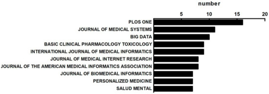 All these 988 publications were published in 212 journals. In addition, 155 (73.1%) journals published no more than 2 papers. It is observed that 9.3% of the publications (92 papers) were published in the top 10 journals. The articles are scattered in MBD-related fields. This phenomenon is mainly because MBD is a new research direction and the study on MBD has not yet formed a systematic hierarchy. The journal with the greatest number of publications is PLoS ONE, with a total of 16 papers. Only 2 journals have published more than 10 papers. The top 10 journals that published the most papers are showed in Figure 3.