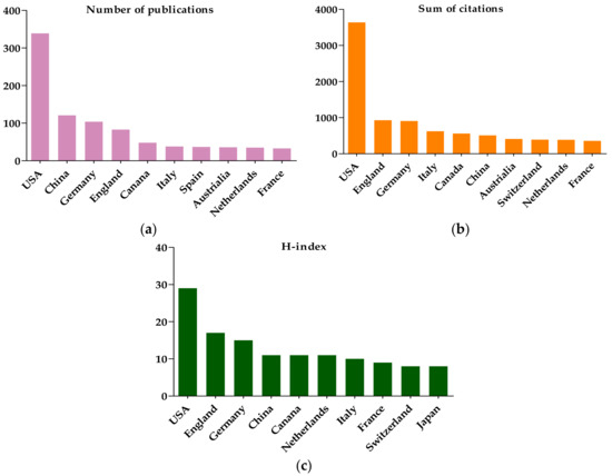 (a) Number of publications; (b) Sum of citations and (c) H-index of MBD-related publications.