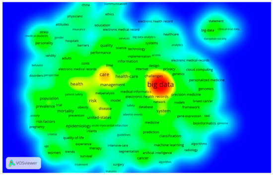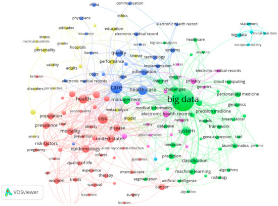 The keyword co-occurrence network of MBD (see Figure 5) was constructed by the VOSviewer software. The size of the nodes and words in Figure 5 represents the weights of the nodes. The bigger the node and word are, the larger the weight is. The distance between two nodes reflects the strength of the relation between two nodes. A shorter distance generally reveals a stronger relation. The line between two keywords represents that they have appeared together. The thicker the line is, the more co-occurrence they have [34]. The nodes with the same color belong to a cluster. VOSviewer divided the keywords of MBD-related publications into 7 clusters. The keyword “big data” has a highest frequency of 203. Other keywords with a high frequency include “care” (70), “risk” (50), and “health-care” (45).