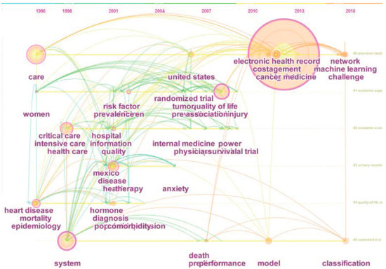 We can make the timeline view by the Citespace software (see Figure 7). It can be seen from Figure 7 that, before 2000, the research on MBD is little and the keywords of that period are concentrated on “women”, “mortality” and “pregnancy”. The research on MBD at this stage is somehow foundational. Entering twenty-first century, the research on MBD began to increase, and the types of keywords are also very extensive. But the keywords in terms of disease, such as “diagnose”, “clinical trial”, “cohort”, “breast cancer” and “risk”, account for large proportions. After 2010, the research issues of MBD had an evolution. There are two main directions: one is the support technique for big data, like “data mining”, “database” and “machine learning”; the other is concerning medical care for specific individuals, like “personalized medicine”, “privacy” and “personality”. This indicates that the MBD study was developing from a disease-centered model towards a patient-centered model [37]. It is noted that the keyword “big data” showed a trend of concentration in 2012. This can be partly attributed to the Obama administration’s big data research and development program. Table 3 lists the keywords of MBD-related publications appeared during different periods.