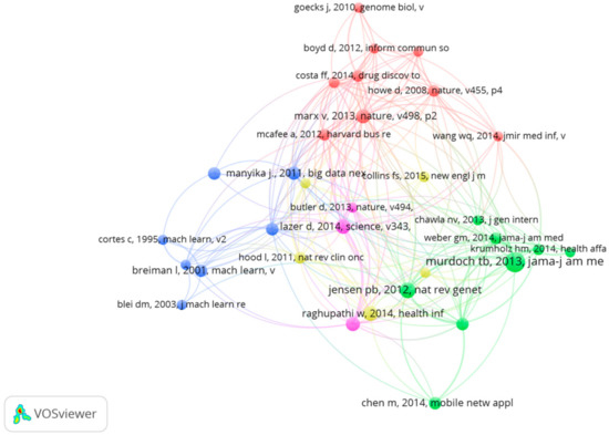 When two papers appeared simultaneously in the third paper’s citations, it is considered that the two papers established a co-citation relationship [44]. Reference co-citation analysis is an important mean to detect the structure and evolution path of a specific domain. Co-citation analysis is a kind of citation network analysis method. It is different from another citation analysis method, namely, the citation quantity analysis method. The citation quantity analysis method is to evaluate the quality of the subjects (journal, author, country, document, type of document, etc.) by the number of citations. Co-citation analysis selects some representative literatures as the analysis object, and then uses the network analysis method to divide these literatures into several clusters. In this way, we can obtain the structure and characteristics of a specific domain. In the reference co-citation network, the importance of nodes does not reveal the high number of citations, but illustrates the research themes that are closely related to MBD-related research. In this sense, the two methods are based on different target subjects and the co-citation analysis is limited to the 988 publications. For example, Murdoch TB’s paper was cited 29 times altogether in those 988 documents, but it was cited 533 times in Google Scholar. Figure 10 shows the reference co-citation network in the field of MBD study. Betweenness Centrality measures the importance of nodes in a network. The specific calculation method is computed by counting the percentage that the shortest path between pairwise nodes in the network passes through the node [24]. From Figure 10, we can find that the biggest node is Murdoch (2013). His paper entitled “The Inevitable Application of Big Data to Health Care” published in JAMA-Journal of the American Medical Association proposed that the use of patient and physician data collection may be an important way to improve the quality and efficiency of health care services [45].