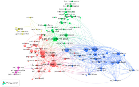 The journal co-citation analysis is not only an efficacious way to study the structure and characteristics of a subject, but also reveals the overall structure of the subject and the characteristics of a journal [46]. We use the VOSviewer software to plot the journal co-citation network. Figure 11 shows the journal co-citation network with 144 nodes. The size of node represents the activity of the journal and the number of published papers. The distance between two nodes is also very important. Generally, the smaller the distance between two nodes is, the higher the citation frequency is. As the visualization illustrated in Figure 11, each cluster has a color that indicates the group to which the cluster is assigned. We can see that all these journals are divided into five clusters. The red cluster contains JAMA-Journal of the American Medical Association, New England Journal of Medicine and Lancet, etc. This cluster represents medical journals. The blue cluster contains Nature, Science and PLoS ONE. This cluster represents science and technology journals. The green cluster represents information journals.