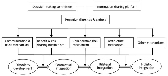 The fifth characteristic of the framework is future-oriented. As a collaboration chain, a win-win collaboration is a supply chain’s ultimate strategic goal [4]. A desired win-win situation can enlarge the joint benefits and reward each partner a share of greater gain that could not be generated by each member on its own [100]. Future-orientation is the cornerstone of the continuous win-win collaboration. In Figure 1, the supply chain collaboration is depicted as an evolution from the current state to an ideal future state. The current state could be disorderly development, contractual integration, or bilateral integration, all moving towards a future ideal state of the holistic integration. The governance mechanisms are also future oriented. For example, both supply chain members’ interests and whole system’s interests were guarded through benefit and risk sharing and communication and trust mechanisms. Further, the sustainable evolution of the supply chain is strengthened by the collaborative R&D and restructuring mechanisms that utilize and update each member’s competitive advantages to develop technologies and processes conducive to the sustainable evolution of the whole supply chain.