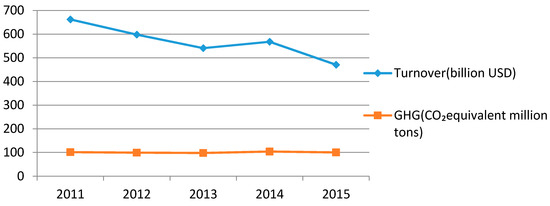 The steel industry is called the “rice of industry” due to its importance as a platform industry of the national economy. It is also true that without sustainable performance of the steel industry, it is impossible for heavy industries, such as the automotive, shipbuilding, and mechanical equipment industries, to be sustainable (see Appendix A). Thus, the steel industry is the platform industry because it is related to the sustainable performance of other industries as well. At the same time, the steel industry is also one of heaviest energy consumers. Its share of energy consumption among manufacturing industries in Korea is 27% [4]. Thus, the volume of GHG produced by the steel industry is overwhelming compared to that by other industries. Hence, the amount of carbon emissions allocation for the steel industry among industries covered by the Korean ETS is also large. Therefore, it is essential to manage the steel industry so that it reduces its GHG emissions by up to 37% until 2030. However, in contrast to the fact that GHG emissions have been stable for five years, as shown in Table 1 and Figure 1, firms’ revenues have been decreasing (Based on the comments by a reviewer, we changed all the turnover volume at the constant dollar terms in 2011. Our current measure (nominal $US) could be affected by price changes, which are unrelated to efficiency measures as a reviewer commented. We checked the possible change in the trend due to the exchange rate fluctuation, and determined there is no significant change. We found there is temporal upturn in 2014 due to the exchange rate fluctuation, but it was not significant to change the empirical results). Therefore, it is important to examine whether this decreasing trend in revenues may or may not stem from the newly-introduced environmental regulation in the steel industry. In addition, from this analysis, we could speculate about the industrial characteristics of ETS-covered steel firms, especially regarding returns to scale, and suggest the optimal way to increase each firm’s performance compared to the benchmark case. This is the basic motivation for this study.