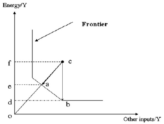 In addition, since SBM always assumes the non-radial approach, it can overcome the limitations of a radial model. We can determine the difference between radial and non-radial approaches in Figure 2. As shown in this figure, under the radial approach, DMU “c” should move to “a” on the efficiency frontier. To move point “a”, “ef” amount of energy input should be saved in this process, because the radial model is based on the proportional reduction and enlargement of variables. However, SBM deals directly with input excess (potential reduction) and output shortfall (potential expansion) of an observation, by using variables called slack variables. The SBM projects the observations to the furthest point on the efficient frontier, in the sense that the objective function is to be minimized by finding the maximum amounts of slacks. Under SBM, “c” could move to “b”, and this means that the value of the potential reduction in energy input could drop from “oe” to “od”. To examine this characteristic of SBM in our empirical study, we will also compare two results derived from a radial and non-radial model, respectively.