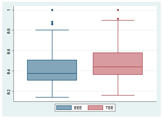 Meanwhile, since the EEE and TEE values did not show a large difference, we conducted a Mann-Whitney test to check the null hypothesis of no group difference. As shown in Table 5 and Figure 3, the M-W test statistic shows a p-value of 0.011, and we can reject the null hypothesis, concluding a significant group difference between TEE and EEE. This result means that TEE overestimates its real efficiency, including the environmental pollution effect, since emitting GHG is inevitable in production. Thus, in E and E studies, it is meaningful to consider undesirable output in order to obtain an unbiased sustainable efficiency value.