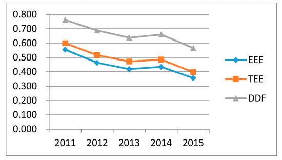 Based on Equation (1) and the related approaches explained above, we can obtain the comparative results for EEE (Environment Energy Efficiency) and TEE (Traditional Energy Efficiency), as shown in Table 4. EEE means efficiency that includes undesirable output when evaluating efficiency, and TEE measures the efficiency that excludes undesirable output. We used the MaxDEA software 6.2 (MaxDEA Co.: Beijing, China) for the calculation of the empirical tests.