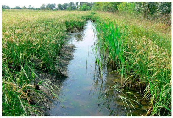 The fish generally stayed among the rice, in nutrient-rich, shady areas. Massive migration to the open trenches—where the water was too warm because of the lack of a shade-providing plant cover and where birds could easily see the fish—occurred only during the draining of the paddies. Losses to smaller fish were caused by aquatic insects, frogs and smaller aquatic birds (marsh terns and gulls), while bigger fish were mainly preyed upon by night herons and grey herons. The unused surface of rice paddies, occupied partly by bunds, and partly by trenches for the fish, made up about 10% of the total area. If the farms were situated close to each other, a qualified fishing master and a fisherman were employed for an area of 200 ha. The method of fish-cum-rice production is still practiced in Hungary during organic (chemical-free) rice growing [40]. Rice paddy preparation is done with laser-controlled machines in order to ensure a bottom slightly sloping toward the outlet. Trenches deeper than usual (30 cm) and bottom drains are constructed so that this ditch system slopes towards the outlet (Figure 1).