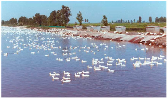 In case of the Pekin meat duck breed used in Hungary, about 48 to 50-day-old ducks (with a selling weight of 2.5 kg) could be reared per year per female. Ducks were hatched in large incubators capable of holding 7000 to 40,000 eggs. After drying off, the hatched ducklings were placed in nursing houses. The nursing took place in special sheds where the ducklings were first kept on 1 m high, wire-mesh tables without contact with the humid litter. In the first stage of rearing (days 1–7, the so-called “warm rearing”), the temperature gradually decreased from 31 °C to 18–20 °C. The feathering and intensive development of the oil gland of ducklings were accelerated by humidifying. In the second week, the ducks were driven to the “cool rearing” unit equipped with an outdoor run. The starter feed used in this period contained 16% protein. By the end of the second week, the ducks’ weight reached 350–450 g. Thereafter, the young ducks were moved to the so-called “training pond” where they got used to extensive rearing conditions. By the end of the third week, their weight was about 800 g. The ducks were then transported to their final habitat, i.e., the fishponds. They were kept either on special duck islands situated in large ponds at some distance from the banks, or on the banks and dykes at a density of 10 ducks/m2. Self-feeders were located on the banks or often above the water, calculating 1 feeder for 200 ducks (Figure 2).