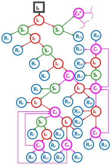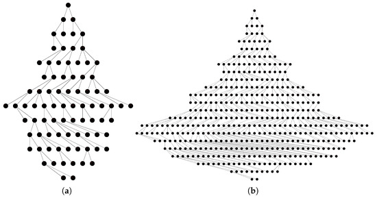 where m is the maximum number of repeats for cycles, that is, with a large m the number of nodes doubles as m increases by 1. However, as we already mentioned before, m is small in the considered case, and therefore, this technique is suitable. The graphical illustrations for a graph without cycles and with cycles, and , are presented in Figure 4.