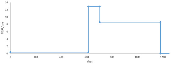 In Table 3, we provide the interval lengths and average daily costs measured in TEUR per day for different project phases. Phase 1 is the phase before the actual building process has begun. Phases 2 and 3 describe the actual construction process; we separate the process into these phases taking into account that the project costs per day are higher at the beginning of the building process. Phase 4 describes the phase where the judicial process can be continued, however, the house construction is finished. The length of the first phase is taken from [19], the total cost is taken from [33] (as was mentioned before). The average daily costs parameter for phase 1, , is calculated by dividing the total costs by . The lengths for last two phases are taken as 90 and 478 days (the estimation for total length is taken from [32]) and the average daily costs are derived from the requirements and . The average daily costs are presented in Table 3. From this data we construct the average costs function (Figure 2):
