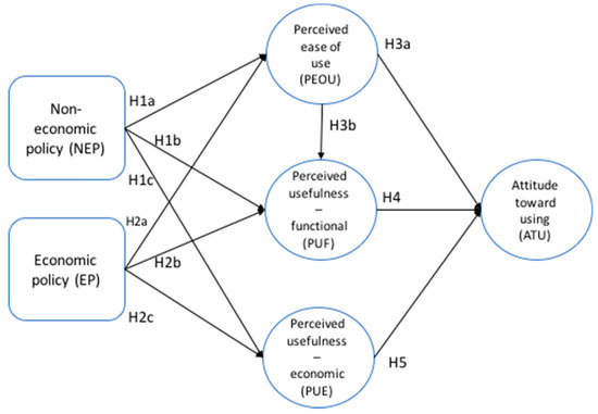 Previous research found that perceived ease of use could affect consumers’ attitudes toward using a system through increasing the perceived usefulness [32,78]. There is little evidence that economic factors affect perceptions of the ease of use. Hence, the influence of PEOU is tested only against perceived functional usefulness. Because PU is divided into two parts in our research, the connection between PEOU and PUF is inferred. We also assume that PEOU affects the AU of RET as in the original TAM. Therefore, the following hypotheses are stated: