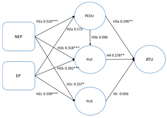 Based on the six components, the conceptual model showed how the influence of EP and NEP affected PEOU, PUF, and PUE and how they all influenced the ATU. PLS-SEM was used to analyze the influence of the constructs in the model on the attitudes of the respondents. The constructs and their match with the properties of the other constructs in the conceptual model were verified by applying Cronbach’s alpha, composite reliability (CR), average variance extracted (AVE), and the factor loadings. The model was analyzed in two phases: First, we analyzed the construct reliability and validity of the measures [78]. Second, we checked the structural model by assessing the factor loadings. The inner weighting scheme used for the PLS-SEM was the path mode.