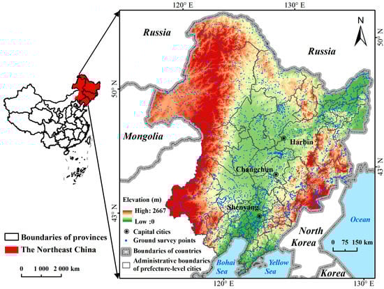 Northeast China (Figure 1) is located between 38°and 54°N and 116° and 136°E, covering an area of 1.25 × 106 km2 [34]. It is located in the eastern Eurasia continent, whose southern part is next to the Bohai Sea and the Yellow Sea of China. The area borders the Mongolian plateau in the west and the Siberian Plateau in the north. Northeast China also adjoins Russia in the north and northeast with boundaries being the Ergun River, Amur River, and Wusuli River. Mongolia is adjacent to the central west of the study area. Northeast China is separated from North Korea by the Tumen and Yalu Rivers. Located in the continental monsoon climate area, the summers are mild and humid and the winters are long and harsh. The mean annual temperature is 2.75–5.72 °C, with an average precipitation of 250–700 mm [35].