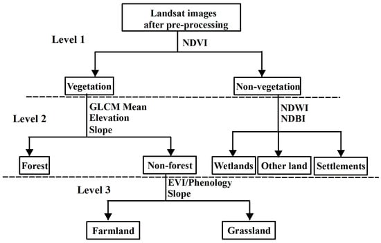 Figure 2. The outline of the decision tree. The threshold of each rule set varied with images. NDVI is the Normalized Difference Vegetation Index (NDVI), calculated from bands four and five of Landsat OLI [47]; GLCM mean is the mean value of the gray level co-occurrence matrix and is widely used in textural features extraction, calculated by the gray scale value of the images [48]. Elevation and slope are calculated from ASTER GDEM V1 data; NDWI is the Normalized Difference Water Index, calculated from bands three and five of Landsat OLI [49]; NDBI is the Normalized Difference Build-up Index, calculated from bands five and six of Landsat OLI [50]; and EVI/Phenology is Enhanced Vegetation Index varied in time, calculated from bands one, four, and five of Landsat OLI [51]. - LULC maps creation for other years: Using the 2015 LULC map as the reference map, the LULC classification maps for 1990, 2000, and 2010 were derived separately using an object-based backdating approach with change vector analysis [44,45]. More details about the classification approach can be found in previous studies [44,45]. Accuracy assessment was also completed for the LULC classification maps in 1990, 2000, and 2010 using historical field survey points and Google Earth images, as well as visual interpretation of the Landsat TM data as reference data. The overall accuracies of these three classification maps were 86% for 1990, 86% for 2000, and 88% for 2010, and that of settlements in the three years were 90%, 91% and 93%, respectively.