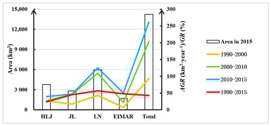 Urban land growth for four provinces in Northeast China. HLJ, JL, LN, and EIMAR are the abbreviations for Heilongjiang, Jilin, Liaoning, and Eastern Inner Mongolia Autonomous region, respectively.
