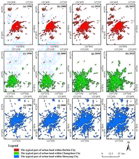 As no international agreement exists on how to define urban land [52,53], urban land in this research was defined as spatially continuous artificial areas in non-village areas, and where the local government office was typically located in Northeast China. Specifically, urban land was extracted in two steps [45]: (1) The class objects “settlements” were selected from the LULC maps as potential urban land; (2) The urban land for 1990, 2000, 2010 and 2015 were separated from villages using the vector layer of points of cities, counties, towns and villages.