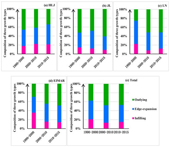The proportion of three expansion types in (a) Heilongjiang (HLJ); (b) Jilin (JL); (c) Liaoning (LN); (d) Eastern Inner Mongolia Autonomous Region (EIMAR); and (e) the total study area over the three decades.