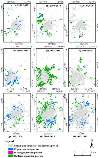To acquire more detailed dynamics information on the urban land expansion patterns in Northeast China, typical urban land sprawl patterns within three capital cities were extracted (Figure 6). The sprawl patterns of typical urban land within Harbin City were similar to the sprawl patterns of urban land in the entire Heilongjiang during the study period, except for the third phase (Figure 6a–c). Typical urban land within Harbin City experienced major outlying expansion. From 1990 to 2000, edge expansion and outlying were the major types of urban land expansion, mainly located in south part of the typical urban land within Harbin City. In the following phase, typical urban land within Harbin City experienced quick growth, and outlying expansion was the dominant type, concentrated in the west. For 2010 to 2015, urban land expansion slowed, and outlying expansion was still dominant type, distributed in the south. For Changchun City, the expansion pattern of the typical urban land aligned with the overall expansion patterns of urban land observed in the entire Jilin during the study period, except for the first phase (Figure 6d–f). In the first decade, edge expansion was dominant, mainly located in the south part. For 2000–2010, typical urban land increased considerably through the outlying major type, concentrated in the west and east. For 2010 to 2015, urban land expansion also decreased and outlying was still the main expansion type distributed in the west and east. However, the expansion patterns of the typical urban land within Shenyang City were different from those of urban land in the entire Liaoning during the study period, except for the second phase (Figure 6g–i). At first, edge-expansion and outlying were the main expansion types, mainly located in the northern and southern urban areas within Shenyang City, respectively. Then, the typical urban land also quickly increased, and outlying was the main expansion type, concentrated in the north. Finally, urban land expanded with the edge-expansion-major type and was distributed in the middle to northern part of the city. Overall, typical urban land sprawl within the three capital cities all clearly increased from 2000 to 2010 following the same major outlying expansion pattern.