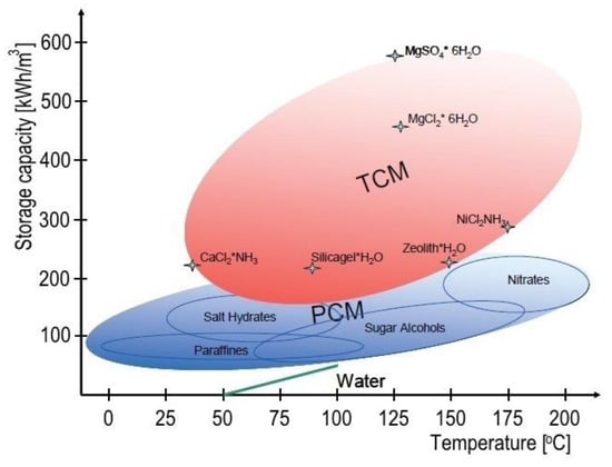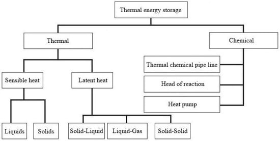Capacity, power, and discharge time are interdependent variables. In some storage systems, capacity and power can also depend on each other. Typical parameters for TES systems are shown in Table 1 [22], including capacity, power, efficiency, storage period, and cost. High-energy storage density and high power capacity for charging and discharging are desirable properties of any storage system. It is well known that there are three methods for TES at temperatures from −40 °C to more than 400 °C: sensible heat, latent heat associated with PCMs, and thermo-chemical heat storage associated with chemical reactions (Figure 2) [23].