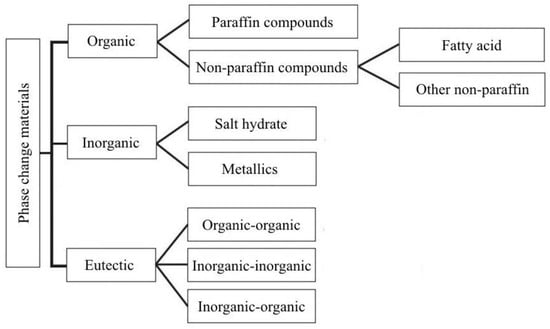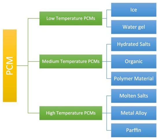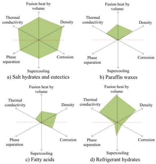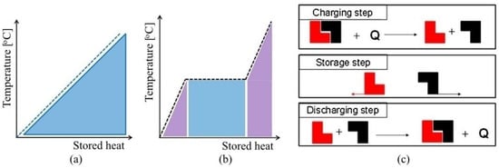 LHS materials are known as PCMs due to their property of releasing or absorbing energy with a change in physical state. The energy storage density increases and hence the volume is reduced, in the case of LHS (Figure 2b). The heat is mainly stored in the phase-change process (at a quite constant temperature) and it is directly connected to the latent heat of the substance. The use of an LHS system using PCMs is an effective way of storing thermal energy and has the advantages of high-energy storage density and the isothermal nature of the storage process.