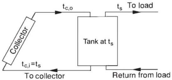 Schematic of a solar combisystem with solar collectors and a boiler charging water storage tank [28].