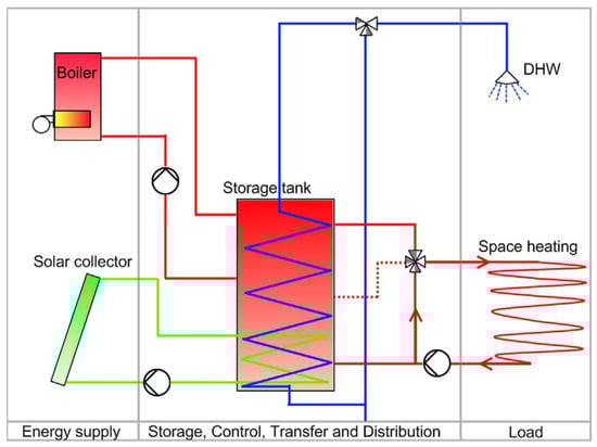 A more complex system with tank storage is shown in Figure 4; a solar combisystem where water store is the central part. The so-called combistore is charged with solar collectors and a second heating source, such as a biofuel or gas boiler, and heat is extracted to two heat sinks of very different characteristics: domestic hot water and space heating [28]. Solar combisystems including combistores were also the topic of the European project Combisol, whose goal was the promotion and standardization of solar combisystems in Europe [29].