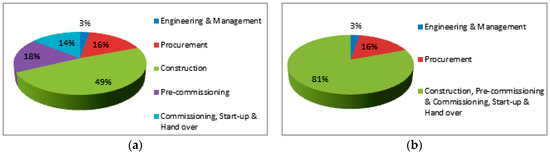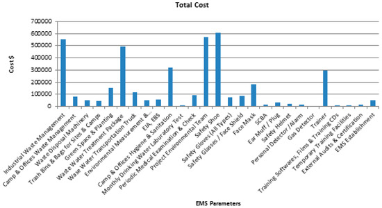 The case study project’s total cost (PTC) based on project’s CBS is 458,302,940 USD using Equation (1). The total EMS costs for project (PEMSC) is estimated as 4,016,951.457 USD by using Equation (2) and Table 1. It shall be noted that the cost of each EMS parameter in Table 1 is calculated using Equation (3). Moreover, the mathematical model for cost estimation of various phases in EPC projects is based on Equations (4)–(6). The criterion selected for cost estimation of each separate phase is based on the CBS adopted in the case study, which does not include the EMS criteria. The cost of the EMS work packages of each project phase should be considered in the project control system (WBS and CBS). Applying the EMS costs of each project phase, separately, the total EMS cost of NGL projects is calculated according to Equation (7) and Table 1.