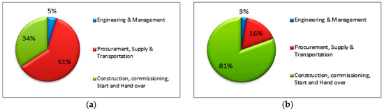 According to Figure 5a, although the procurement, supply and transportation phase shows the maximum WF% of 61% but its value in implementation of project environmental management is 16%. On the other hand, the total project execution in construction, commissioning, start-up and hand over phase with the total WF of 34% has a higher importance than the total project execution in other phases. This phase, also, shows a WF of 81% for project environmental management and related work packages. Indeed, the high executional workload, establishment of environmental infrastructures, necessity for establishing a proper and efficient system, conducting training courses and environmental control are main factors in this phase. It is while the engineering and management phase with the WF of 5% (minimum financial value) in project and 3% in environmental management has less financial importance, respectively.