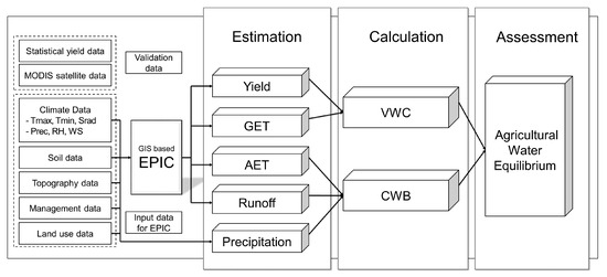 Before assessing the agricultural water equilibrium, the four variables estimated using the GEPIC model were verified to evaluate the performance of the model. However, GET was estimated by same algorithms of AET, and observational data on river basins were used in the case of runoff, due to which there were some limitations in verifying the grid-based estimates in cropland. Thus, in this study, we verified the estimates made based on the crop yield, which were then used to calculate the VWC and the AET, which were further used to calculate the CWB.