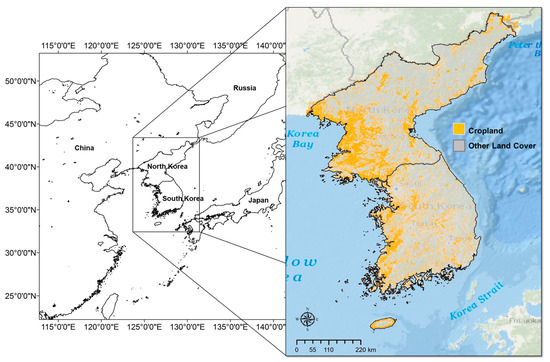 The study area was the Korean Peninsula, which includes the entirety of South and North Korea located between latitudes of 33.23° N and 43.01° N and longitudes of 124.14° E and 130.93° E (Figure 2). The spatial resolution was set at approximately 1 km for the raster datasets that were used as input data and all results are reported at the same spatial scale.